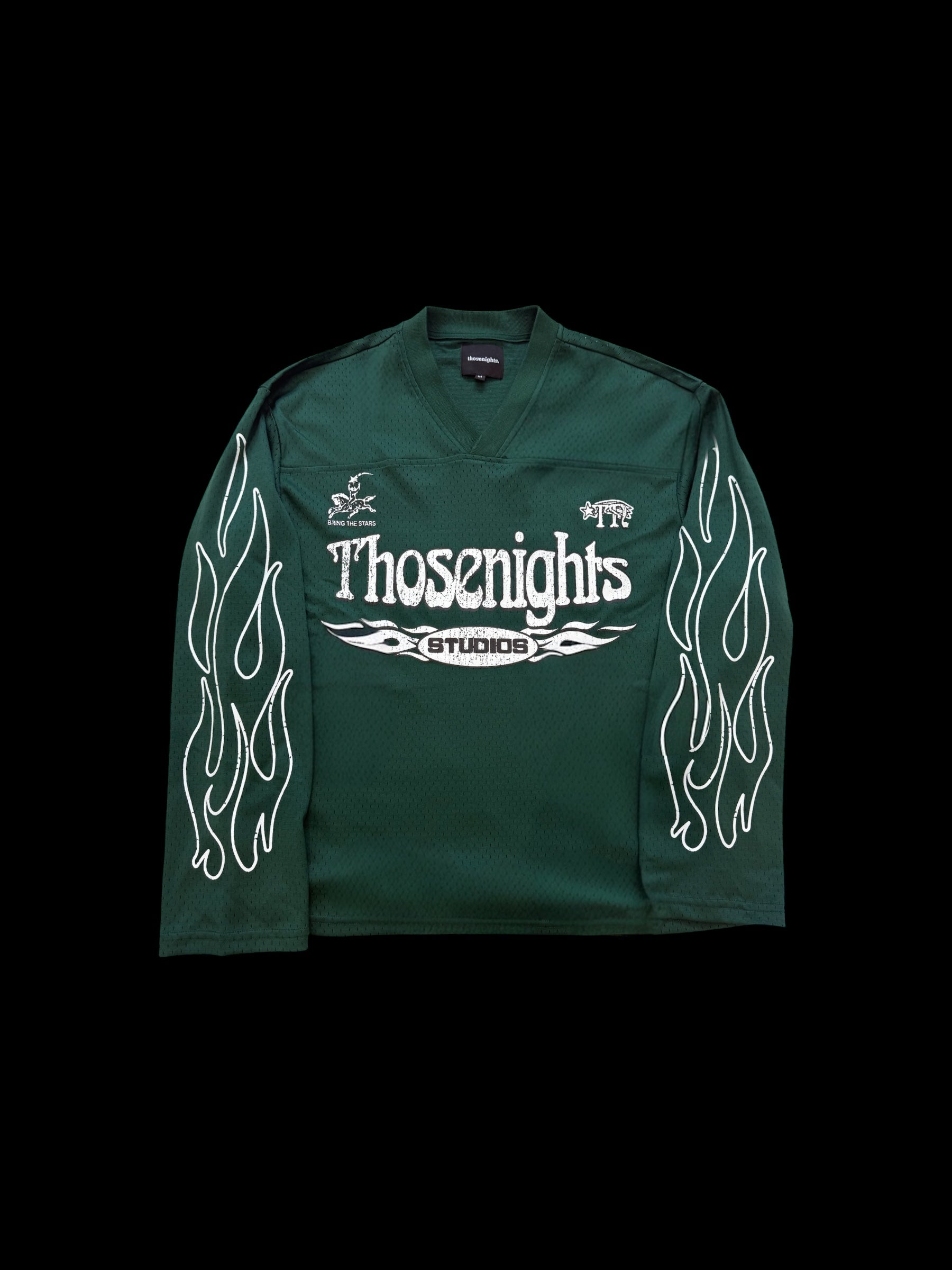 • Features: Long sleeves with flame print, bold “Thosenights Studios”.